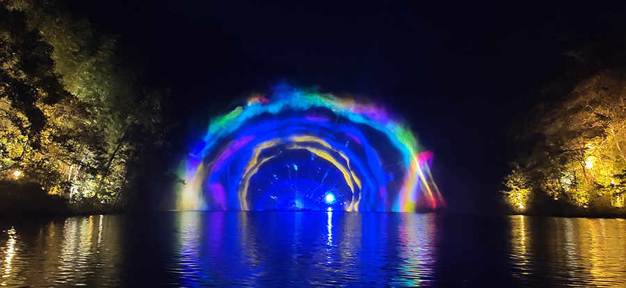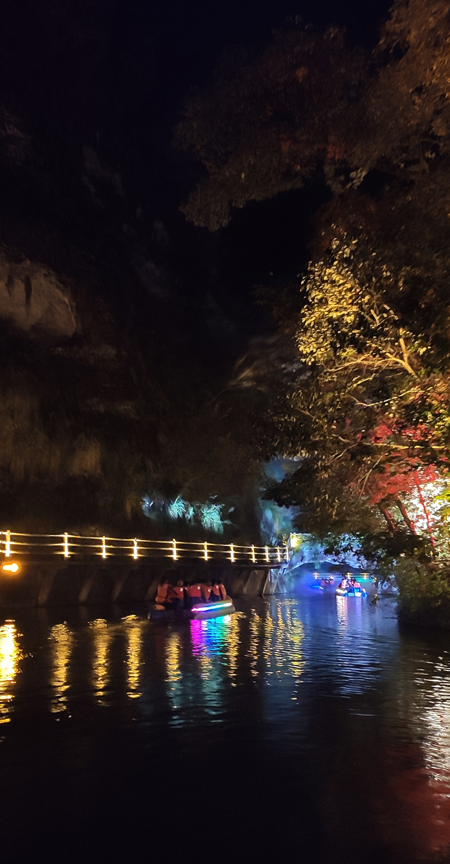 入夜,黨支部一行來到本次文旅最精彩的項目:“夜游九龍?zhí)?rdquo;。以“夜游九龍?zhí)?,靜享夜的美”為主題的“行進式”水上峽谷夜游景區(qū),利用現(xiàn)代化聲光技術(shù)與景區(qū)自然美景有機融合,讓您充分感受“詩意山水,光影幻境”。聽蛙唱蟲奏,觀月下仙境,月光映水,水波映月,加上臨水棧道邊笛聲陣陣......讓您真切的領會空靈、幽靜、夢幻的別樣意境。一路的聲光風景讓人目不暇接,如果不是身臨其境,絕對感受不到那光影與大自然結(jié)合產(chǎn)生的絕妙意境。