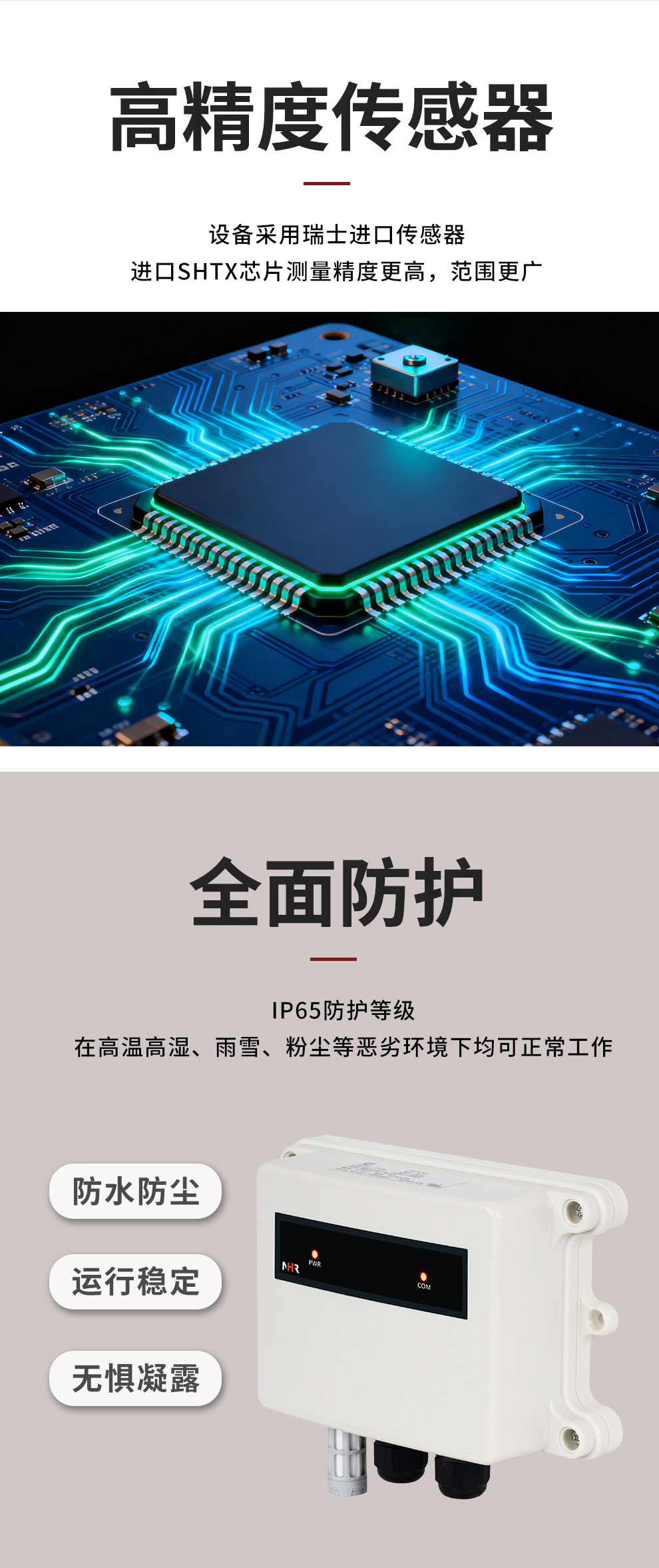 虹潤公司是專業(yè)生產(chǎn)環(huán)境監(jiān)測儀表的國家專精特新“小巨人”企業(yè)。生產(chǎn)的一體式溫濕度變送器,具有溫度、濕度、露點高精準的測量與變送,報警繼電器輸出,RS485/RS232通訊,IP65防護等級等特點。產(chǎn)品獲得一種手持式低功耗溫濕度檢測儀、大屏幕溫濕度記錄儀等2項國家發(fā)明專利,主持起草物聯(lián)網(wǎng)智能溫度儀表通用技術條件、冷鏈溫度記錄儀等2項國家標準,以及通信系統(tǒng)多通道數(shù)據(jù)采集控制終端規(guī)范軍用標準,以及現(xiàn)場設備集成等5項智能制造國家標準,參與國際5G標準制定,取得溫濕度儀表等3項相關軟件著作權(quán)。產(chǎn)品廣泛應用于工業(yè)現(xiàn)場、農(nóng)業(yè)大棚、倉儲物流、地下管廊、養(yǎng)殖孵化、配電機房等諸多領域。