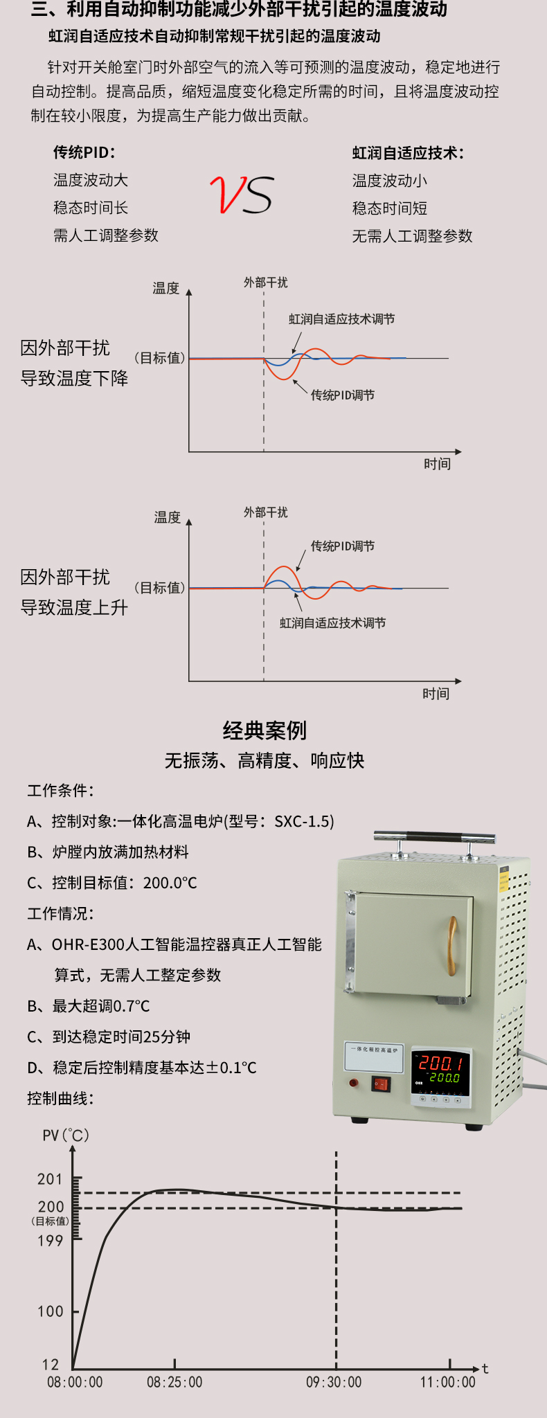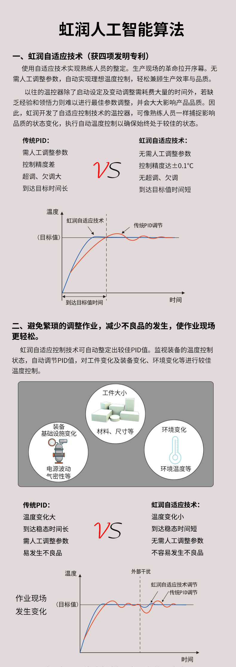 虹潤(rùn)公司是專業(yè)生產(chǎn)溫控器的國(guó)家專精特新“小巨人”企業(yè)。生產(chǎn)的人工智能溫控器,具有真正人工智能算式,無(wú)需人工整定參數(shù),控制精度可達(dá)±0.1°C,多種輸出類型,高抗干擾等特點(diǎn)。產(chǎn)品獲得模糊PID控制儀及控制方法、人工智能調(diào)節(jié)器、智能化控制器、移相觸發(fā)控制器、閥門自動(dòng)手動(dòng)無(wú)擾動(dòng)操作控制方法及裝置等5項(xiàng)國(guó)家發(fā)明專利,主持起草工業(yè)過(guò)程控制系統(tǒng)用模擬輸入兩位或多位輸出儀表、物聯(lián)網(wǎng)智能溫度儀表通用技術(shù)條件、工業(yè)過(guò)程測(cè)量和控制系統(tǒng)用智能調(diào)節(jié)器等3項(xiàng)國(guó)家標(biāo)準(zhǔn),以及通信系統(tǒng)多通道數(shù)據(jù)采集控制終端規(guī)范軍用標(biāo)準(zhǔn),參與國(guó)際5G標(biāo)準(zhǔn)制定,取得模糊PID溫控儀等3項(xiàng)相關(guān)軟件著作權(quán)。產(chǎn)品廣泛應(yīng)用于電力、石化,冶金、制藥、食品等幾乎所有工業(yè)現(xiàn)場(chǎng),實(shí)現(xiàn)精準(zhǔn)控溫,保障生產(chǎn)安全與質(zhì)量。