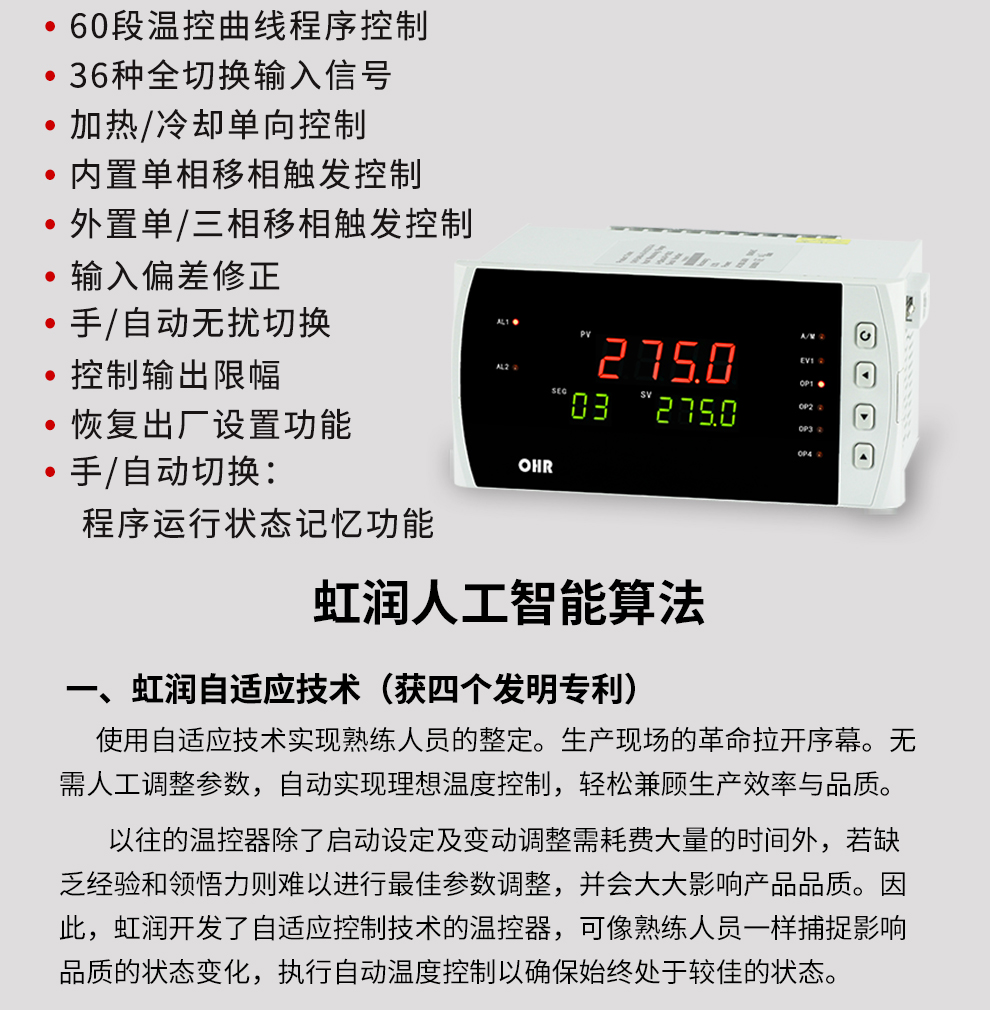 虹潤公司是專業(yè)生產(chǎn)溫控器的國家專精特新“小巨人”企業(yè)。生產(chǎn)的程序段智能溫控器,具有真正人工智能算式,無需人工整定參數(shù),控制精度可達(dá)±0.1°C,60段溫控曲線程序,無超調(diào)、欠調(diào)等特點(diǎn)。產(chǎn)品獲得模糊PID控制儀及控制方法、人工智能調(diào)節(jié)器、智能化控制器、移相觸發(fā)控制器、閥門自動手動無擾動操作控制方法及裝置等5項(xiàng)國家發(fā)明專利,主持起草智能溫度儀表通用技術(shù)條件、工業(yè)過程控制系統(tǒng)用模擬輸入兩位或多位輸出儀表、工業(yè)過程測量和控制系統(tǒng)用智能調(diào)節(jié)器等3項(xiàng)國家標(biāo)準(zhǔn),,以及通信系統(tǒng)多通道數(shù)據(jù)采集控制終端規(guī)范軍用標(biāo)準(zhǔn),參與國際5G標(biāo)準(zhǔn)制定,取得60段PID自整定調(diào)節(jié)器等3項(xiàng)相關(guān)軟件著作權(quán)。產(chǎn)品廣泛應(yīng)用于電力、石化,冶金、制藥、食品等幾乎所有工業(yè)現(xiàn)場,實(shí)現(xiàn)精準(zhǔn)控溫,保障生產(chǎn)安全與質(zhì)量。