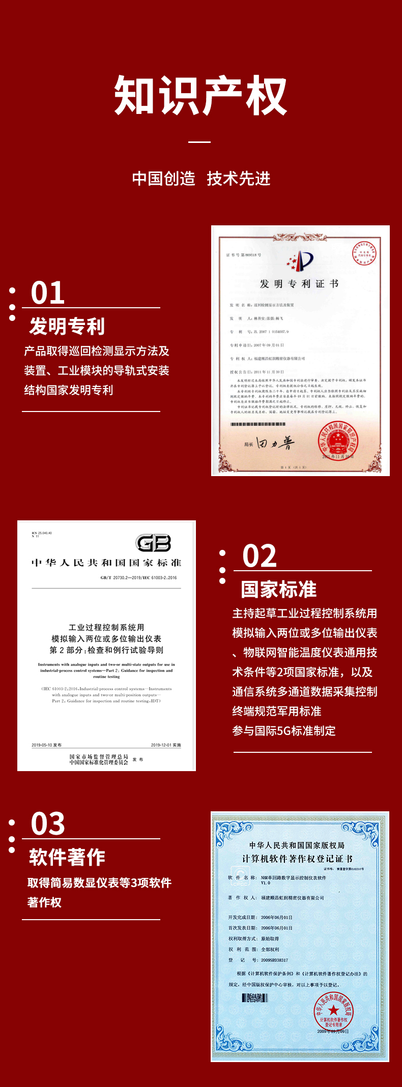 虹潤(rùn)公司是專業(yè)生產(chǎn)數(shù)顯表的國(guó)家專精特新“小巨人”企業(yè),生產(chǎn)的導(dǎo)軌式數(shù)顯儀表,具有全切換信號(hào)輸入,導(dǎo)軌壁掛共用,全隔離設(shè)計(jì),高抗干擾,變送輸出或RS485通訊等特點(diǎn)。產(chǎn)品獲得巡回檢測(cè)顯示方法及裝置、工業(yè)模塊的導(dǎo)軌式安裝結(jié)構(gòu)等2項(xiàng)國(guó)家發(fā)明專利,主持起草工業(yè)過(guò)程控制系統(tǒng)用模擬輸入兩位或多位輸出儀表、物聯(lián)網(wǎng)智能溫度儀表通用技術(shù)條件等2項(xiàng)國(guó)家標(biāo)準(zhǔn),,以及通信系統(tǒng)多通道數(shù)據(jù)采集控制終端規(guī)范軍用標(biāo)準(zhǔn),參與國(guó)際5G標(biāo)準(zhǔn)制定,取得簡(jiǎn)易數(shù)顯儀表等3項(xiàng)相關(guān)軟件著作權(quán)。產(chǎn)品廣泛應(yīng)用于電力、石化、冶金、化工、造紙、食品、輕工、制藥、熱處理、水處理、機(jī)械配套等各種工業(yè)現(xiàn)場(chǎng)。