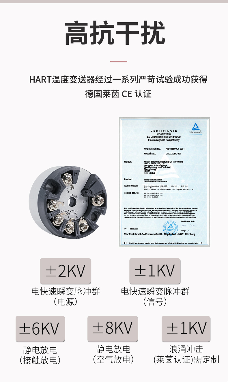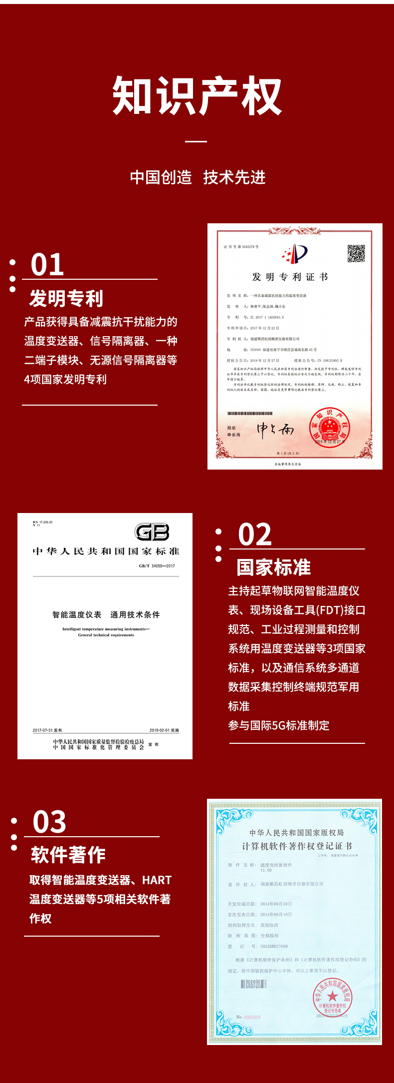 虹潤公司是專業(yè)生產(chǎn)溫度變送器的國家專精特新“小巨人”企業(yè)。生產(chǎn)的智能溫度變送器,具有適配各類溫度傳感器,精度高,穩(wěn)定性好,通過編程線修改輸入信號(hào)類型及量程,高抗干擾等特點(diǎn)。該產(chǎn)品不僅通過HART基金會(huì)認(rèn)證、德國萊茵 CE 認(rèn)證與 SIL 功能安全認(rèn)證,還獲得具備減震抗干擾能力的溫度變送器、信號(hào)隔離器、一種二端子模塊、無源信號(hào)隔離器等4項(xiàng)國家發(fā)明專利,主持起草物聯(lián)網(wǎng)智能溫度儀表、現(xiàn)場(chǎng)設(shè)備工具(FDT)接口規(guī)范、工業(yè)過程測(cè)量和控制系統(tǒng)用溫度變送器等3項(xiàng)國家標(biāo)準(zhǔn),以及通信系統(tǒng)多通道數(shù)據(jù)采集控制終端規(guī)范軍用標(biāo)準(zhǔn),參與國際5G標(biāo)準(zhǔn)制定,取得智能溫度變送器、HART溫度變送器等3項(xiàng)相關(guān)軟件著作權(quán)。產(chǎn)品廣泛應(yīng)用于石油、化工、電力、冶金、制藥、食品、水處理等各種工業(yè)領(lǐng)域。