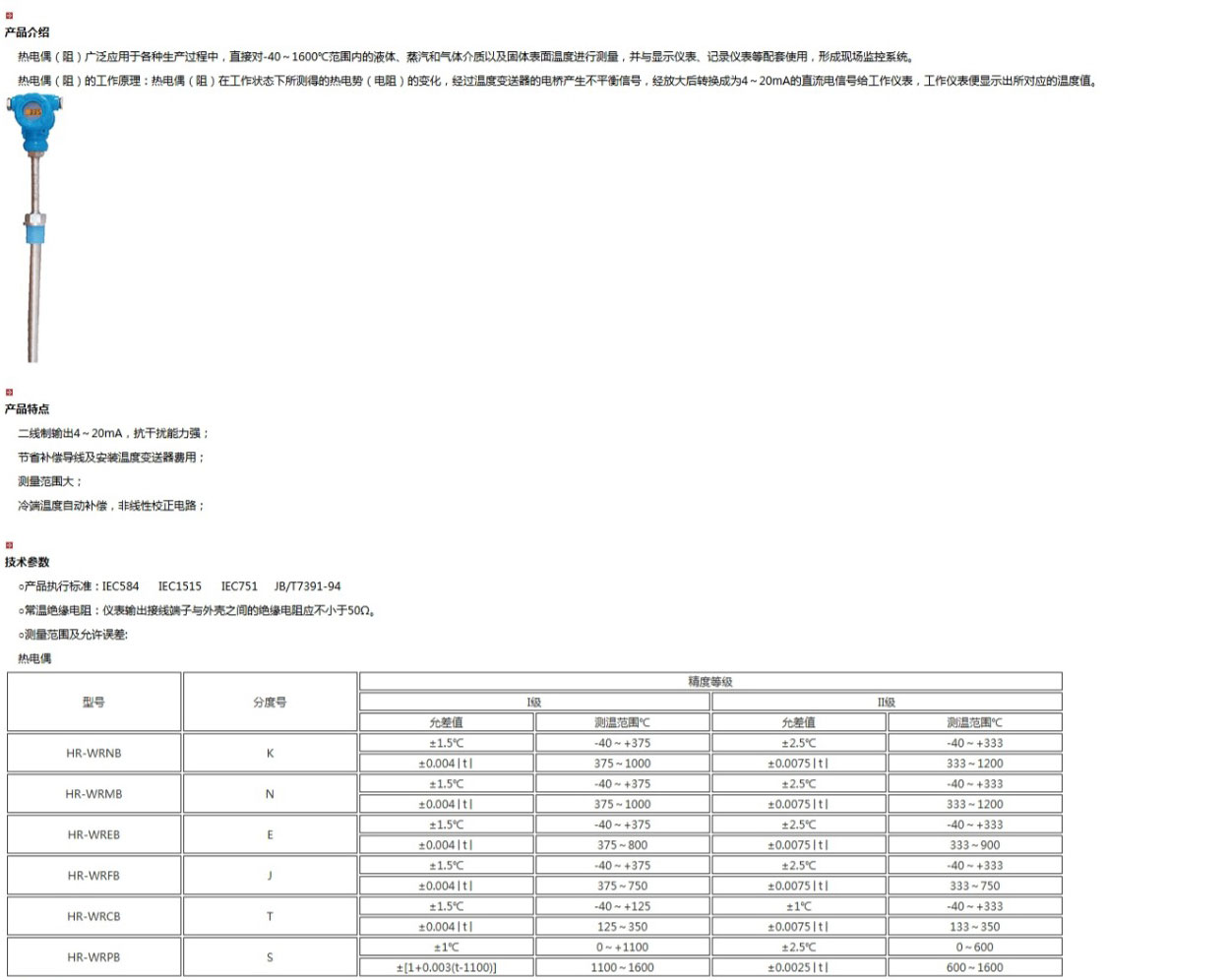帶溫度變送器熱電偶(阻),由基準源、冷端補償、放大單元、線性化處理、V/I轉換、斷偶處理、反接保護、限流保護等電路單元組成。它是將熱電偶(阻)產生的熱電勢經冷端補償放大后,再帽由線性電路消除熱電勢與溫度的非線性誤差,最后放大轉換為4~20mA電流輸出信號。