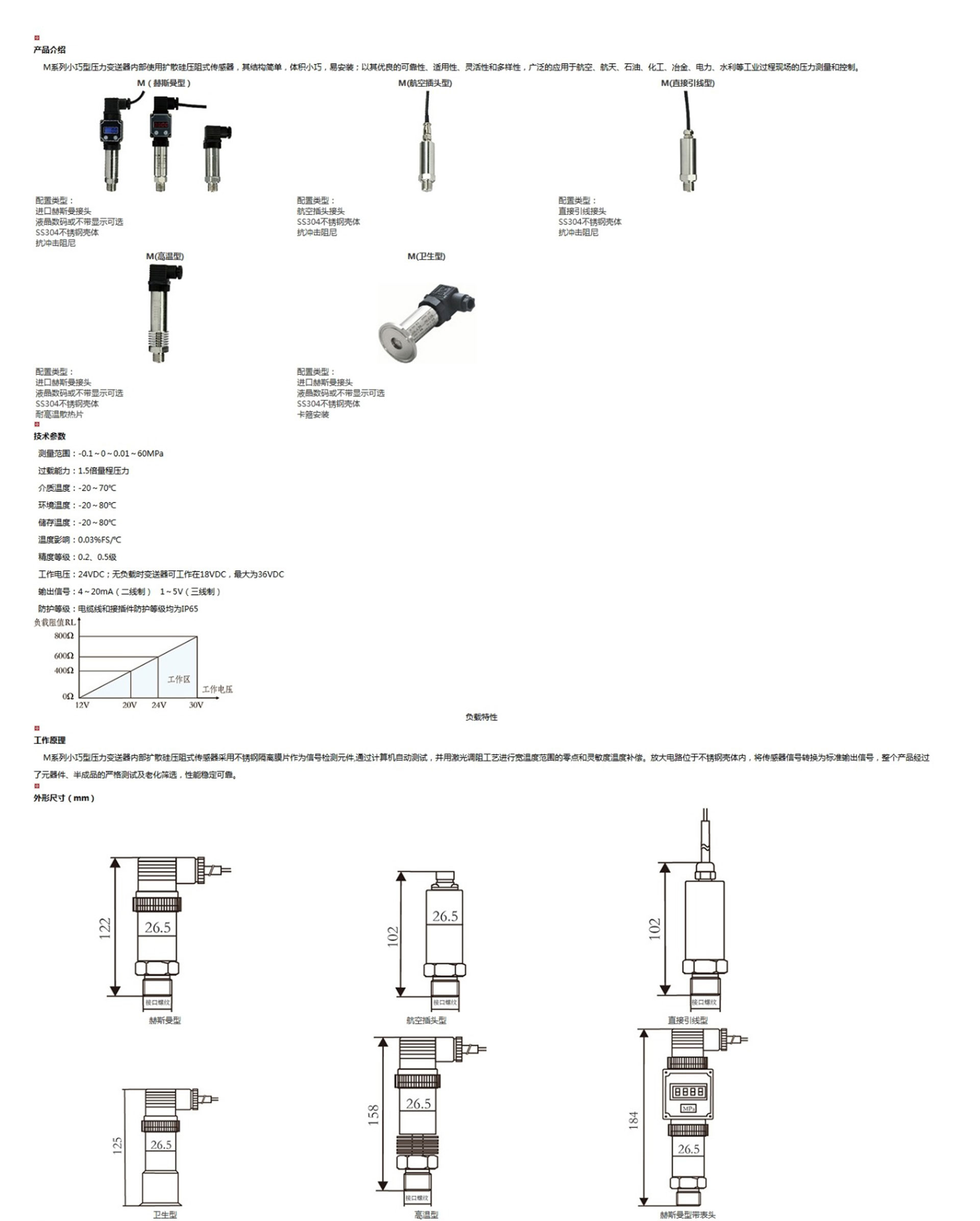 M系列小巧型壓力變送器內(nèi)部使用擴散硅壓阻式傳感器,其結(jié)構(gòu)簡單,體積小巧,易安裝;以其優(yōu)良的可靠性、適用性、靈活性和多樣性,廣泛的應(yīng)用于航空、航天、石油、化工、冶金、電力、水利等工業(yè)過程現(xiàn)場的壓力測量和控制。