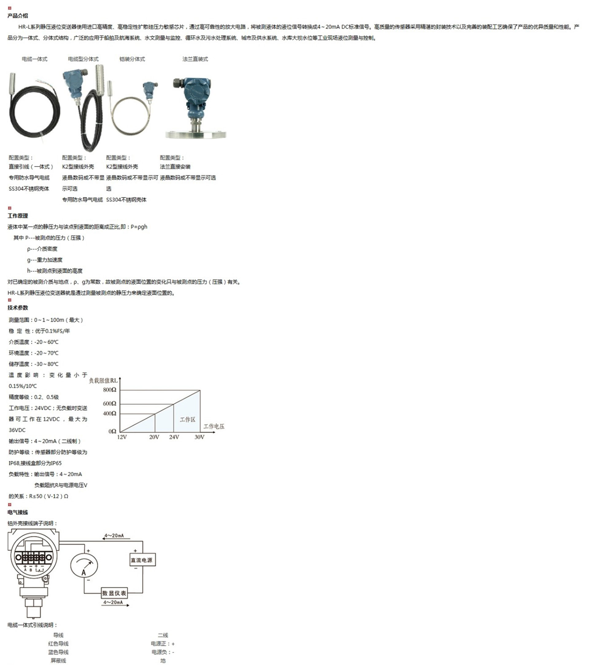 HR-L系列靜壓液位變送器使用進口高精度、高穩(wěn)定性擴散硅壓力敏感芯片,通過高可靠性的放大電路,將被測液體的液位信號轉換成4~20mA DC標準信號。